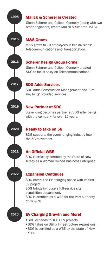 In 1998, Colleen Connolly and Glenn Scherer, along with two other engineers, created Malick & Scherer and set off on a strategic mission to raise the bar currently being offered from engineering services. Keeping steadfast to this objective, M&S evolved into a dominant player in the engineering worlds of both ‘transportation’ and ‘telecommunications’. In 2016, the two divisions amicably split into separate companies and the 'telecommunications' group became known as Scherer Design Group (SDG).